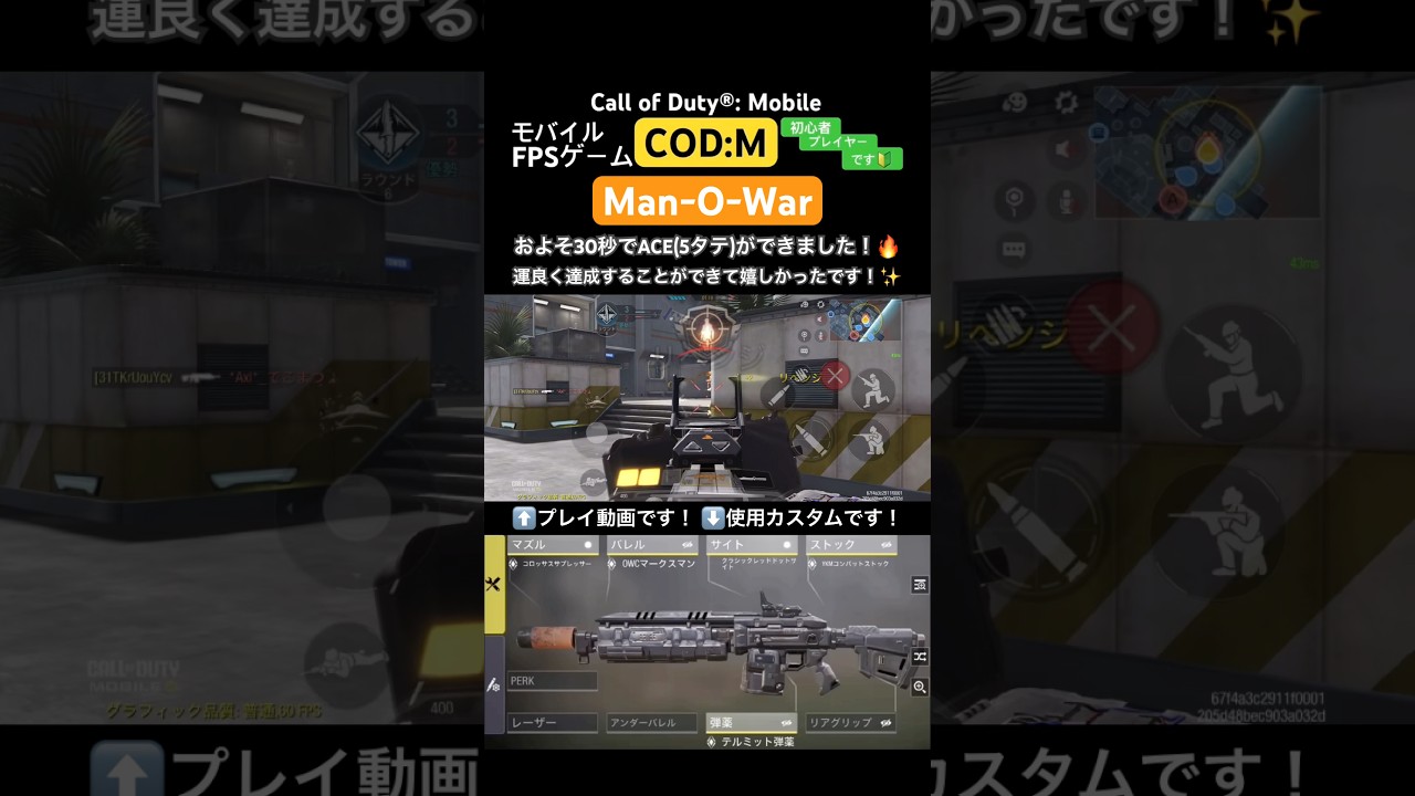 ご視聴いただきありがとうございます!「Call of Duty®: Mobile」というモバイルゲームで、Man-O-Warというアサルトライフルを使用してプレイした動画です!運良くおよそ30秒でACE(5タテ)を達成することができて嬉しかったです!!🔥