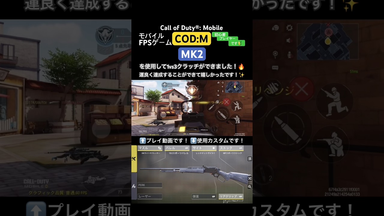 ご視聴いただきありがとうございます!「Call of Duty®: Mobile」というモバイルゲームで、MK2というマークスマンライフルを使用してプレイした動画です!運良く1vs3クラッチを達成することができて嬉しかったです!!🔥